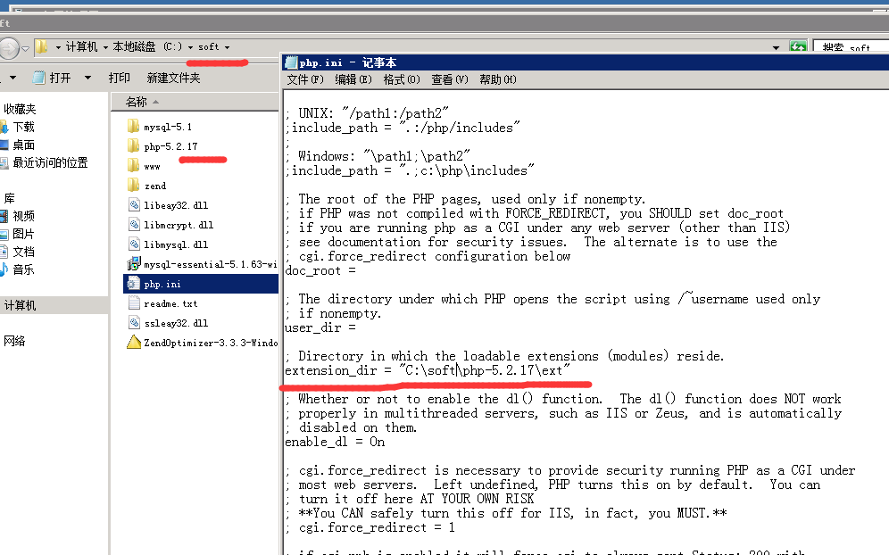 打开解压文件中的 php.ini  文件  找到 并把extension_dir "./"改为extension_dir = "C:\soft\php-5.2.17\ext "